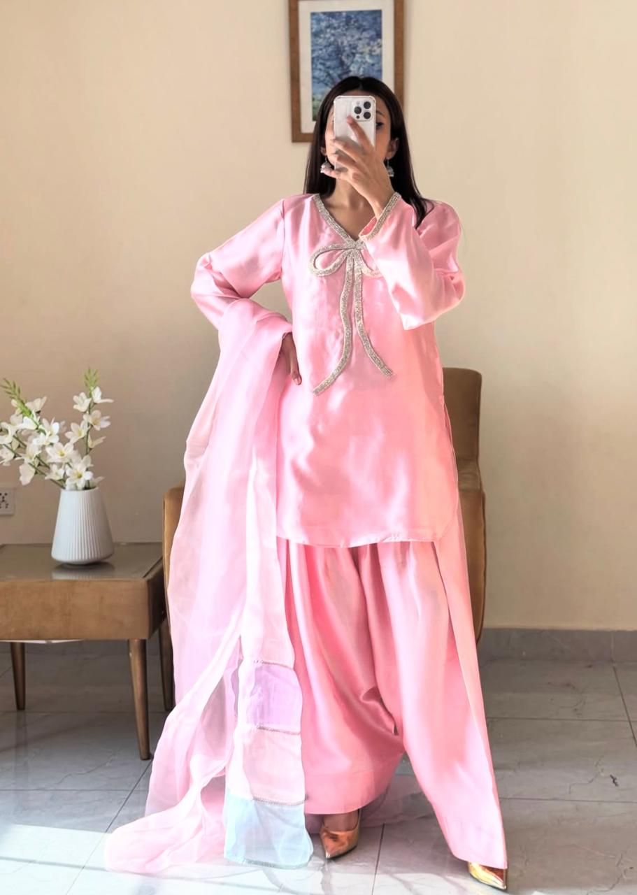 Fabric : China silk Article includes: Shirt, Dupata and Trouser• Shirt: Short Shirt bow style emblished neckline purly handwork •Dupata : Tissue oragnaza Dupata with 3 different colour combination • Trousers: Farshi shalwar