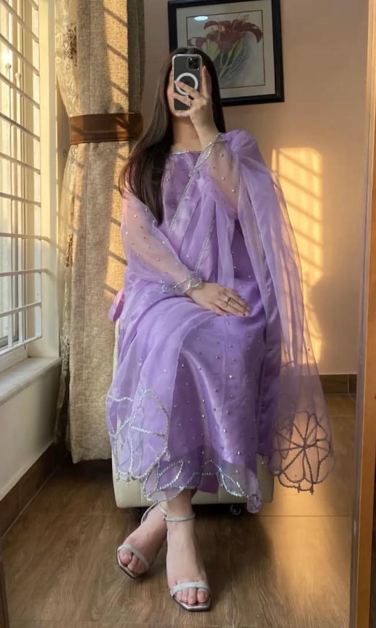 Fabric : Tissue organza with katan silk Article includes: Shirt, Dupata and Trouser• Shirt: Long Shirt heavily rihnestone purly handwork •Dupata : Tissue oragnaza Dupata with side design finishing • Trousers: straight Pants